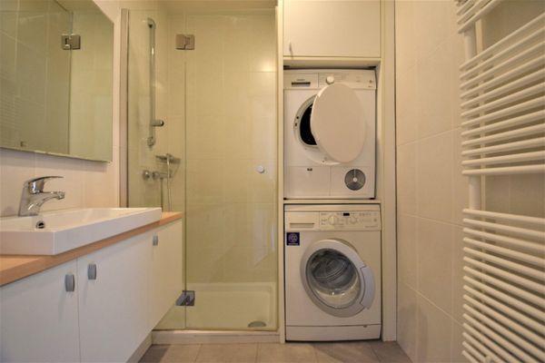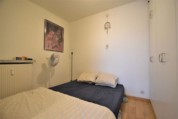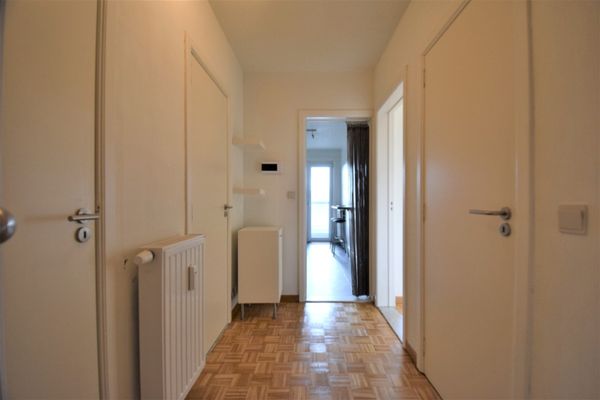 Indeling: Inkomhal met vestiaire en apart toilet. Afsluitbare bureauhoek aanwezig in de inkomhal. Woonkamer met parketvloer. Apart moderne keuken voorzien van alle toestellen met toegang tot terras. Slaaphoek met kasten op maat en kan afgesloten worden met de woonkamer door een schuifwand. Praktisch ingerichte badkamer met douche, lavabo en plaats voor wasmachine en droogkast. Vooraan een zuidwest georiënteerd terras. Kelderberging en gemeenschappelijke fietsenberging in de residentie. Het appartement wordt verhuurd aan € 800/maand excl. verbruikkosten.