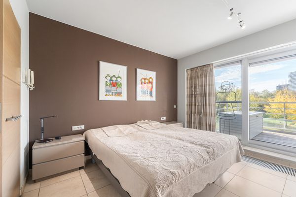 Indeling: Ruime inkomhal met vestiaire kast en gastentoilet. De royale leefruimte met zit- en eethoek baadt in het licht dankzij grote raampartijen. Via de leefruimte heeft u toegang tot een ruim zonneterras met zicht op het park. Volledige geïnstalleerde open keuken met werkblad in natuursten, ingericht met stoomoven, oven, microgolfoven, koelkast, vaatwasser, inductie kookplaat en dubbele spoeltafel. Bureau ingewerkt in maatkast. In deze leefruimte is een geluidsinstallatie van Bose aanwezig. Technische berging. Het appartement telt twee ruime slaapkamers en twee badkamers: één met inloopdouche, dubbele lavabo en toilet, en één met ligbad, enkele lavabo en toilet. De masterbedroom heeft toegang tot apart bureau/logeerkamer, dressing en een tweede ruim zonneterras. Verder is er een praktische berging ingericht als wasplaats. Het appartement beschikt over een alarminstallatie.