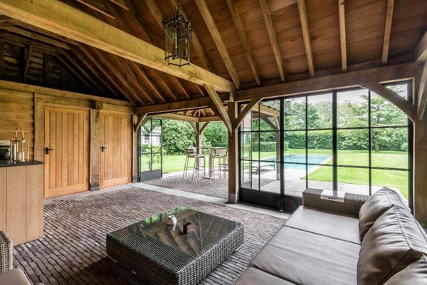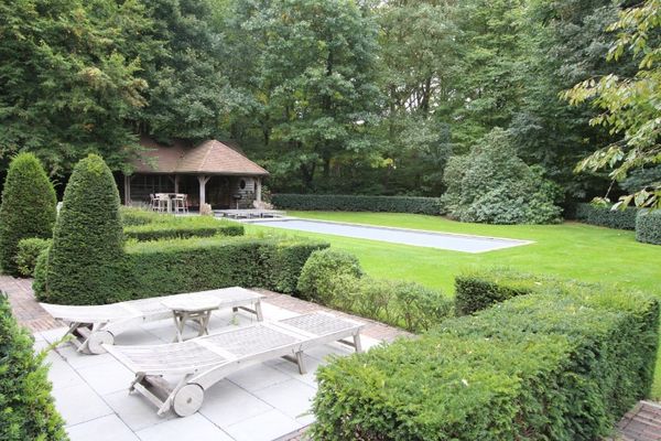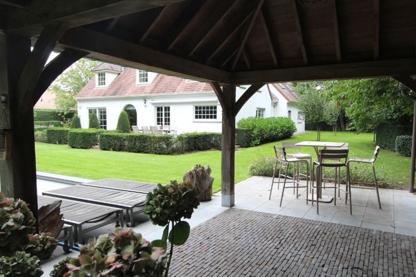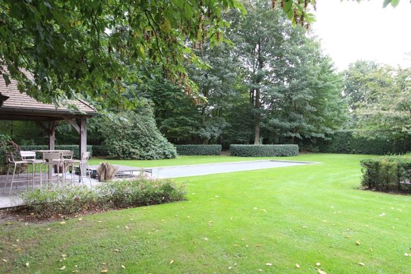 Indeling: Inkomhal met natuursteen vloer, gastentoilet en op maat gemaakte vestiaire. Lichtrijke woonkamer met plaats voor eettafel en zicht op de tuin. De keuken kan afgesloten worden van de woonkamer door schuifdeuren. Lichtrijke keuken met plaats voor eettafel en toegang tot zuidgericht terras. Aanpalend de keuken is er een koele berging. Bureau op maat gemaakt. Wasplaat volledig ingericht met kasten en schoenenkast. Dubbele garage met plaats voor extra koelkast of diepvries. Op het verdiep: Nachthal met parketvloer en tweede toilet. Masterbedroom met dressing en badkamer. Tweede en derde slaapkamer, elk 12,50m2. Tweede badkamer met ligbad en dubbele lavabo. Vierde slaapkamer met bureau en hobbykamer. Tuin werd volledig aangelegd volgens plan van tuinarchitect. Terras bestaat uit blauwe hardsteen en kleiklinkers. Verschillende terrassen voorzien zoals één nabij de keuken, een zonneterras, een derde aan de petanquebaan en aan het poolhouse nabij het zwembad. Verwarmd inox zwembad van 12m op 4m, verwarmd door middel van een warmtepomp. Het eiken poolhouse voorziet een overdekt gedeelte en een afsluitbaar gedeelte met ramen in staal. Er is een bar voorzien, technische berging en kleedkamer. Deze tuin heeft zijn eigen bos met natuurlijk wandelpad waar het tuinhuis en opslag voor hout uit het zicht staan. Daar vindt u ook het uitzonderlijke kippenhok. Deze villa heeft een unieke locatie en is gelegen op een uitzonderlijk perceel.