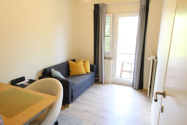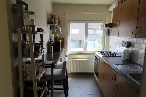 Indeling: Inkomhal, woonkamer met aanpalend een aparte geïnstalleerde keuken. Berging. Masterbedroom en tweede slaapkamer (kleine kamer) met toegang tot terras. Badkamer met douche, toilet en lavabo. Terras met berging. Garagebox op afgesloten binnenkoer verplicht bij aan te kopen aan € 20.000. De verwarmingsketel en alle ramen zijn vernieuwd. Geen lift in het gebouw, wel een syndicus. Momenteel is het appartement verhuurd aan € 850/maand. Vrij lente 2026.